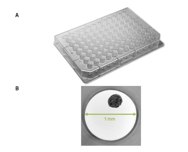 A. Akura™96板的角度视图。B. Akura™球体微孔板中的人肝脏显微组织,孔径正好为1mm。